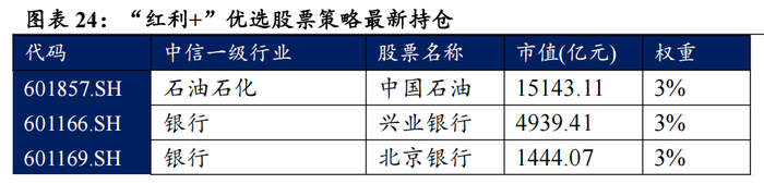 我们在红利策略的基础上,根据股息率要素筛选出“红利+”优选的股息率增强股票组合。根据股票的波动、ROE、估值和盈利增长等因子,筛选出具备该因子特征的股票。同时满足几类因子特征的股票被定义为“红利+”优选股票池。在此基础上,我们为规避股票组合中较小市值股票权重占比过高带来的风格偏移,我们仅从优选股票池中中证800指数和中证1000指数的成分股中挑选高股息标的,最终筛选出30只股票构成“红利+”优选股票策略。