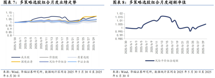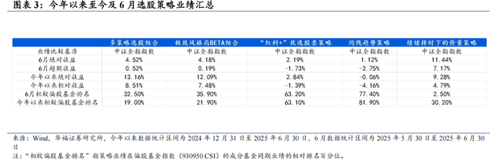 本报告针对多策略选股策略月度业绩统计区间为2025年5月30日至2025年6月30日。6月多策略选股策略绝对收益4.52%,多策略选股策略相对中证全指超额收益0.52%。