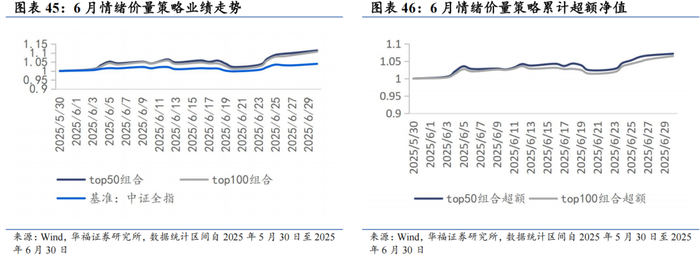 2025年6月,情绪价量策略top50组合绝对收益11.44%,相对中证全指指数超额收益7.17%;top100组合绝对收益10.73%。相对中证全指指数超额收益6.49%。今年以来截至6月30日,情绪价量策略top50组合绝对收益9.28%,相对中证全指指数超额收益4.80%;top100组合绝对收益12.09%,相对中证全指指数超额收益7.49%。