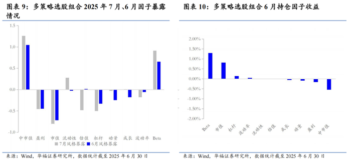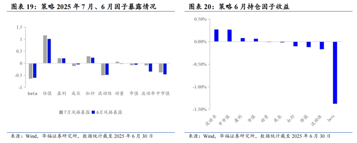 2025年7月份最新持仓与6月因子暴露情况存在差异,相对于2025年6月份中市值的正向暴露有所放大;估值、盈利和杠杆的正向暴露有所收敛。成长的暴露由正转负。在流动性、动量和市值的负向暴露有所放大,在Beta、波动率的负向暴露有所收敛。