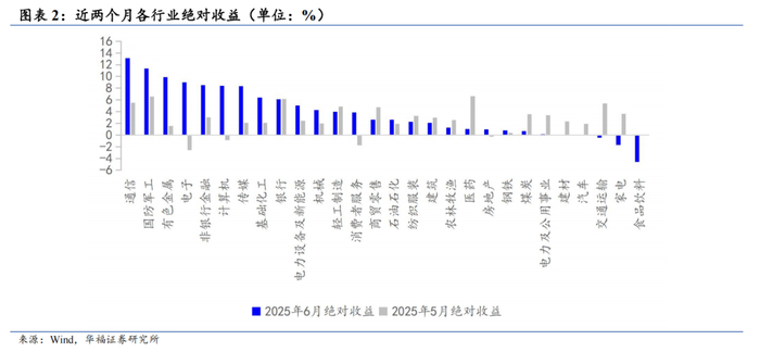 6月板块整体收益上涨,中信一级行业排名前3的行业有通信、国防军工和有色金属。建材、汽车、交通运输、家电和食品饮料行业下跌。