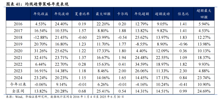 均线趋势策略相对中证全指超额收益显著,各年度超额表现相对稳定。从年化收益表现上看,增强策略取得不错的收益表现,2016年初至2025年6月30日年化收益13.82%,相对于中证全指自2016年初至2025年6月30日年化超额收益14.31%,信息比为0.99。