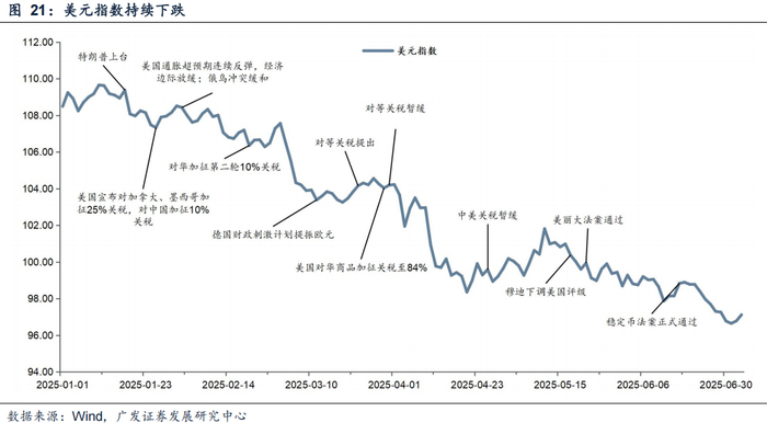 “大美丽”法案在参众两院获得通过,使得美国财政进一步宽松,短期对美国经济增长形成支撑,但可能会导致二次通胀风险,导致美联储降息推迟。而在美国双赤字严峻的背景下,市场对美国财政可持续性担忧加剧。