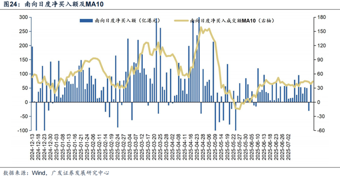 南向资金本周保持净流入。本周(6月30日—7月4日)南向资金净流入额138.92亿港元,上周为净流入283.8亿港元。个股层面,南向资金净买入额排名靠前的个股包括中芯国际(净买入52.29亿港元),建设银行(净买入39.09亿港元),信达生物(净买入20.42亿港元);净卖出额排名靠前的个股包括阿里巴巴-W(净卖出77.72亿港元),小米集团-W(净卖出46.31亿港元),腾讯控股(净卖出39.09亿港元)。
