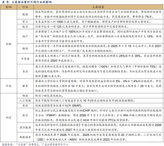 中观层面,“大美丽”法案对美国各行各业长期辐射效应不容小觑。该法案的最终版本为部分特定行业带来显著税赋优势,但同时也削减了其他部分行业的优惠政策。