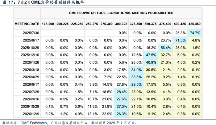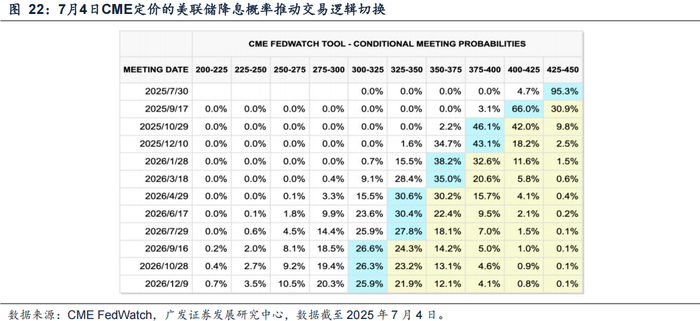 7月3日至今转向定价第2条和第3条逻辑:7月3日公布的非农数据大超市场预期,失业率在政府部门就业核心托举作用下重回4.1%;7月4日大美丽法案最终获得通过。市场交易出现丝滑切换,预期降息节奏放缓,7月降息概率不到5%,年内降息次数重新定价为2次,出现股涨债跌的局面。