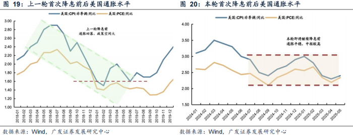 经济基本面方面,本轮美联储降息受到“滞胀”风险掣肘。2019年降息前,美国CPI与PCE处于下降通道,通胀水平在1.5%左右的水平;本轮降息周期以来,通胀水平反复,中枢位于2.5%左右,叠加关税带来输入性通胀的风险,美联储的降息决策“两难”问题会更加凸
