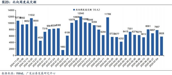 北向资金本周日均成交额下降。本周(6月30日—7月4日)北向资金总成交金额为0.58万亿元,日均成交额为1456亿元,较上周日均成交金额减少507亿元。