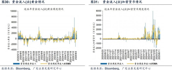 本周黄金资金保持流入,加密货币板块资金流入规模减少。截至本周三(6月26日—7月2日),资金净流入14.3黄金亿美元,相比上周流入28.1亿美元减少。加密货币资产周度资金净流入10.4亿美元,相比上周流入21.1亿美元减少。