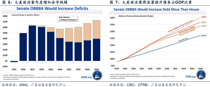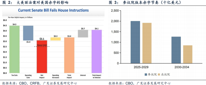 “大美丽”法案将使得美国财政进一步宽松,短期对美国经济增长形成支撑,但可能会导致二次通胀风险,导致美联储降息推迟,引发市场对美国财政可持续性担忧加剧。