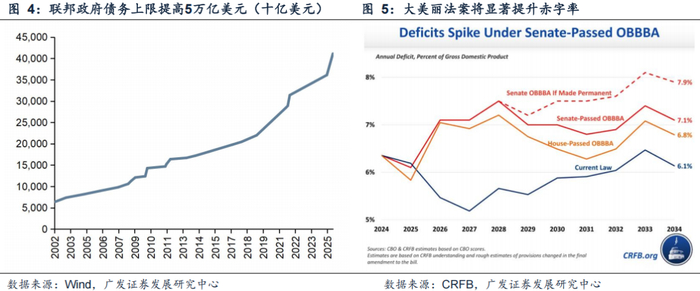 最终版本将提高联邦法定债务上限5万亿美元,这也是美国史上最大幅度的债务上限调整。此举旨在避免美国政府2025年8-9月触及债务上限“X-Date”的风险,并为2025-2026财年政府支出提供“缓冲空间”。
