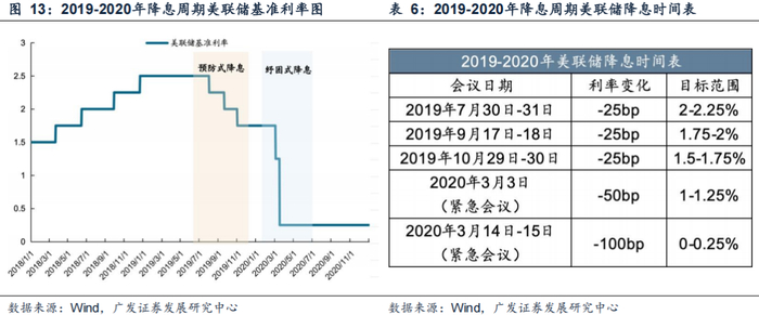 美联储在2019年—2020年进入上一轮降息周期。在2018年12月末加息25bp后,直至2019年7月末才正式进入降息周期,在连续三个月内累计降息75bp,且彼时经济基本面较稳定,故属于预防式降息;2020年3月,新冠疫情对经济产生严重冲击,美联储接连降息150bp,基准利率范围低至0%-0.25%,属于纾困式降息。