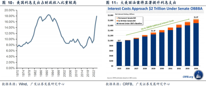 大美丽法案本质是特朗普对上一任期减税政策延续,也是其实现MAGA目标的一步棋。大美丽法案出台后,“税收”成为MAGA目标实现的重要抓手,也标志特朗普政府从优化政府效率减税加关税,重回财政刺激和关税的老路。具体体现为对外加征关税,对内实行全面的减税计划。当前美国利息支出占财政收入比重高达18%,为使赤字规模进一步扩大,而债务压力可控,特朗普政府急需低利率为财政刺激提供融资,因此短期内美联储降息的节奏成为市场关注焦点。