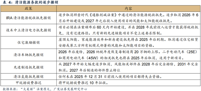新能源行业将遭受较大的影响,传统能源将获利。最终法案对的核心政策包括提前数年废除太阳能、风能项目的投资税收抵免和生产税收抵免,被视为对拜登政府《通胀削减法案》清洁能源激励体系的系统性调整。初步来看,其对公用事业级风光项目构成阻力,进而牵动多元工建公司及配套制造商的订单节奏。但“安全港”条款允许法案通过后 12 个月内开建的项目继续沿用《通胀削减法案》激励, 45X 制造业抵免维持不变,并取消了可能抬高项目成本 20% 的新增消费税,且公用事业规模的可再生能源开发可能仍是满足国内电力需求的重要贡献者;因此部分光伏与储能企业仍有望受益。与此同时,针对“受关注外国实体”(FEOC)的新限制加大了来自中国等国设备的供应链挑战,需持续关注后续执行细则。