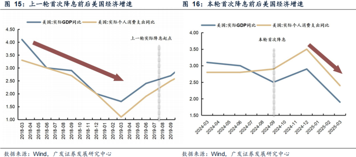 (2)本轮“财政扩张+降息”与上一轮相比面临阶段性差异。我们理解,包括财政超预期扩张、经济基本面变化、关税影响不确定性、美元信用裂痕等方面。预计降息交易不会“一帆风顺”。
