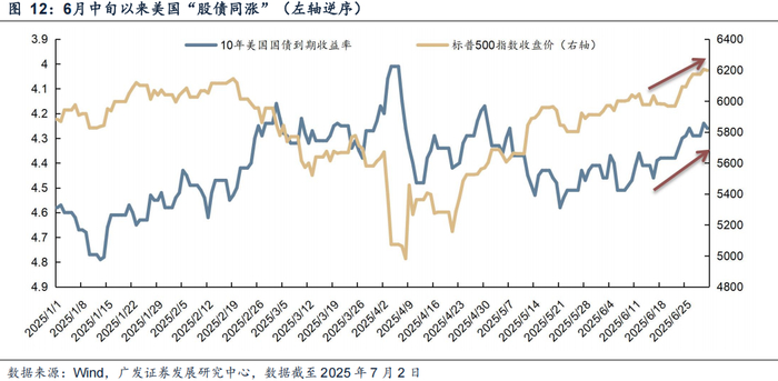 6月中旬以来美国出现“股债同涨”的局面。6月中旬以来,标普500指数延续上升趋势,于6月27日确认突破“对等关税”前高点,此后继续上扬不断刷新历史新高。10年期美债收益率中枢从6月初接近4.5%的水平,回落到近期4.26%左右。债市与股市共同走牛。