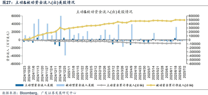 美股主被动资金流出幅度减小。截至本周五(6月30日—7月4日),美股主动资金流出7.9亿美元,相比上周流出16.4亿美元规模减小;被动资金流出11亿美元,相比上周流出31.8亿美元规模减小。