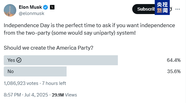 当地时间7月4日,美国总统特朗普签署“大而美”税收和支出法案,使其生效。法案签署成法的几个小时前,马斯克再次在社交平台上发布有关建立新党派“美国党”的投票。截至5日中午,已经有超过108万个账号参与投票,其中64.4%选择了“是”,35.6%选择了“否”。