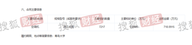 搜狐财经发现,青岛大学6月23日与青岛海源合商贸有限公司签订青岛大学学生宿舍空调采购安装项目合同,项目合同金额为718.09万元,主要标的数量为7217台,主要标的单价为995元。