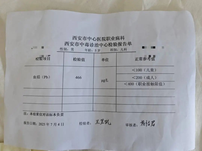 罗宁不放心,带着孩子去医院想自己再查一遍,却得知医院目前不做血铅检验。“他爸爸还在幼儿园开会,我直接带着孩子来西安看了。”西安中心医院给出的检验报告显示,孩子的血铅检验值是466微克/升。“我都吓死了,职业病的大人最多也不能超过400。”