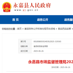 浙江省永嘉县市场监督管理局2025年第6期食品安全你点我检情况的通告