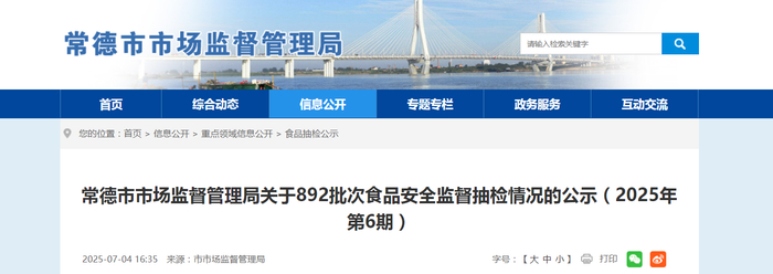 湖南省常德市市场监督管理局关于892批次食品安全监督抽检情况的公示(2025年第6期)