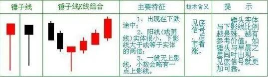 1、锤子线:市场在做空一段时间后,价格不断下跌,卖方力量逐步消耗,而买方力量慢慢积聚,在某一交易日,价格大幅下跌,但底部此时以明显呈现极强的吸纳愿望,有买家大力将价格上推,一直达到当天最高收市或是接近最高收市价位收市。锤子线,一般处于下跌势中,表明市场可能见底,如果当天收市价高于开市价(红色锤子线),对于买方更是利好标志。