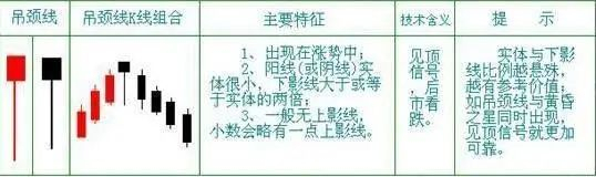 2、上吊线:市场在屡屡做多后,买卖双方力量达到平衡,在一个交易日内,多方努力将价格上推,创出当天新高后,并无心维持高位,价格大幅下跌,卖方力量势不可挡,多日来卖方被压制的能量瞬间释放,价格大力下挫,但当天收市价仍处于较高位置,接近最高价,形成实体部分相当小。上吊线,一般处于上扬市中,表明市场可能见顶,阴线比阳线效果更好。