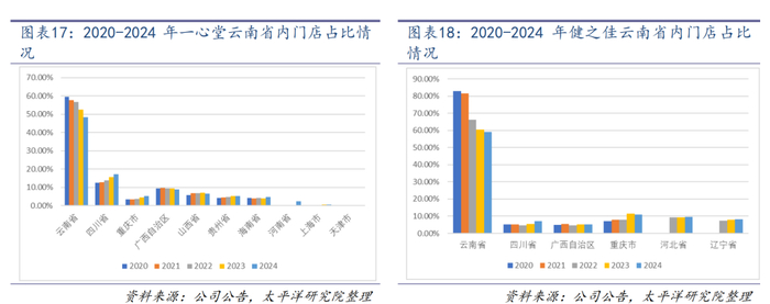 从省内头部连锁药店省外拓展情况来看,2020-2024年实现持续省外拓展,其中一心堂省内门店占比由2020年的59.46%下滑至2024年的48.49%,下滑10.97%,省外在四川和河南占比出现明显提升;健之佳的省内门店占比则从2020年的82.86%下滑至2024年的59.17%,共下滑23.69%,省外拓展加速,尤其在河北省、辽宁省和重庆市实现快速布局和拓展。