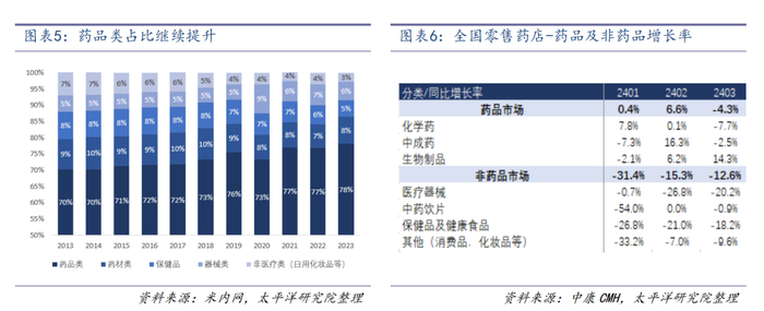 另据中康CMH的数据统计,我们看到2024年Q1药品市场的增速同样大幅超过非药品的增速,其中1-3月医疗器械和保健品类的销售下降明显,一定程度上是受到了经济大环境的影响,非刚性类的健康品消费需求有所下滑。