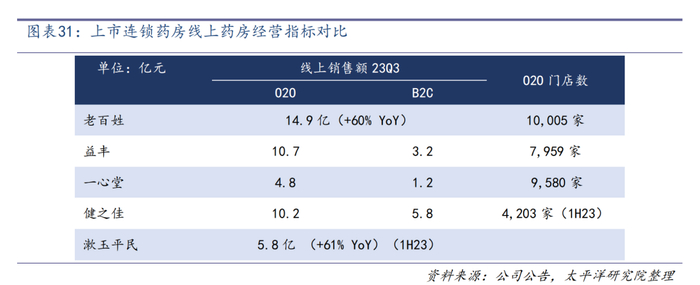 公司定位中高收入和年轻客群,在保健品、个人护理品、功能性护肤品等品类方面有较大投入,且业内仅有的药店+便利店模式打开多业态经营局面,非药品类销售占比同业最高。我们认为监管对于药店非药品类销售和展示的放松将利好公司在健康品类的优势和长期积累。此外,公司线上业务的收入占比属同业中较高水平,在各类电商平台上广泛布局,B2C业务有较好的流量支持,也自建了O2O平台佳e购,获得大量私域流量。
