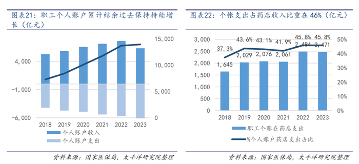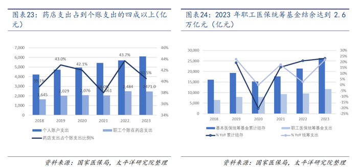 2023年个账资金在药店中的支出占到了个人账户总支出的40.5%,虽然考虑到改革后个账资金收入大约减少一半,但是在医院端支出同样减少(医院门诊纳入统筹)的背景下,我们认为总体上仍能满足消费者在药店消费的资金需求。