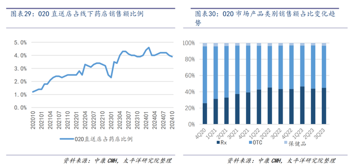 根据中康CMH的数据,截至2024年10月,O2O销售占比已经达到线下药店销售总额的4.1%,并将保持上涨趋势。而在网售处方药政策放开和处方外流的带动下,O2O销售中处方药份额占比也持续提升。
