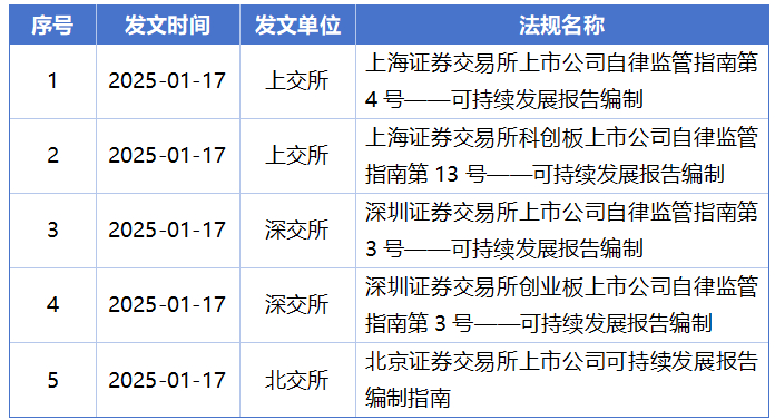 2025年1月17日,沪深北三所基于《可持续发展报告指引(试行)》,细化并颁布了《可持续发展报告编制指南》(以下简称《指南》),规范了上市公司的可持续发展信息披露,促进了实践,增强了可持续发展意识。