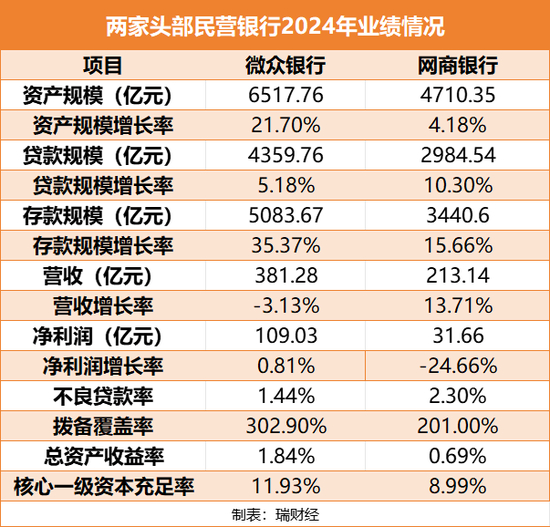 从2024年度总资产收益率来看,微众银行为1.84%,网商银行为0.69%,后者低了1.15个百分点。