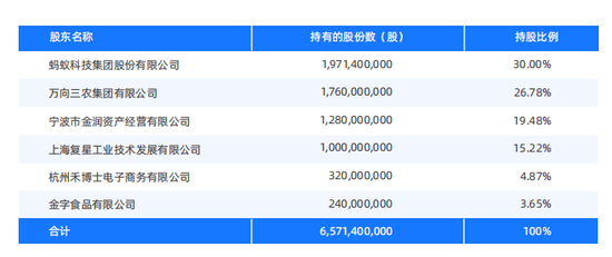 从股东分布来看,网商银行由六大股东组成。截至2024年底,蚂蚁科技集团持有19.71亿股,比例30%,万向三农集团、宁波市金润资产经营、上海复星工业技术发展、杭州禾博士电子商务、金字食品分别持股26.78%、19.48%、15.22%、4.87%、3.65%。