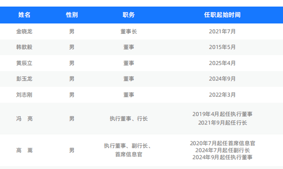 网商银行董事韩歆毅为蚂蚁集团执行董事、CEO,董事黄辰立为蚂蚁集团副总裁、天弘基金管理有限公司董事长,副行长、首席信息官高嵩曾先后担任阿里金融中台技术负责人、蚂蚁微贷事业群架构师、网商银行首席架构师等职务。