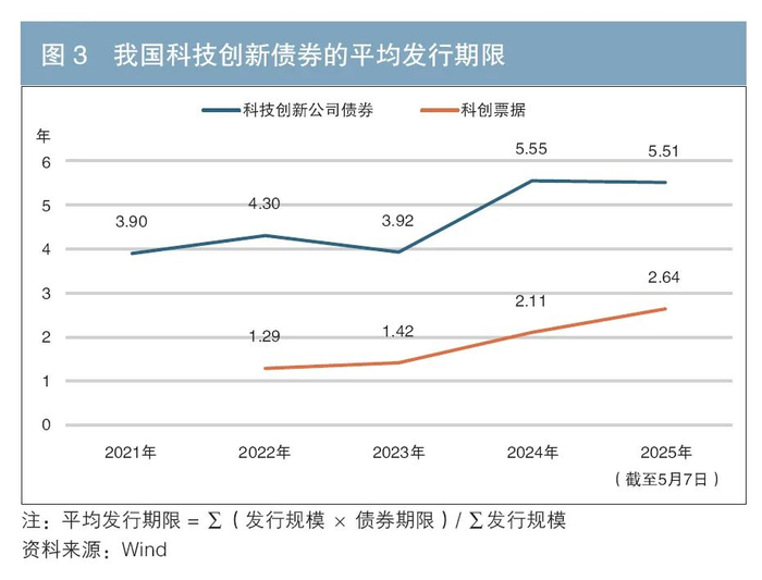 三是科技创新债券发行期限呈上升趋势,主要集中在5年期以内。截至2025年5月7日,已发行的科技创新公司债券和科创票据的期限以5年期以内为主,占比达到90%。近年来,科技创新债券发行期限已呈上升趋势。具体来看,2024年,科技创新公司债券的平均发行期限为5.55年,较2023年的3.92年显著上升;科创票据的平均发行期限为2.11年,较2023年的1.42年也有明显上升(见图3)。同时,10年期及以上品种逐步涌现,但占比仍偏低。