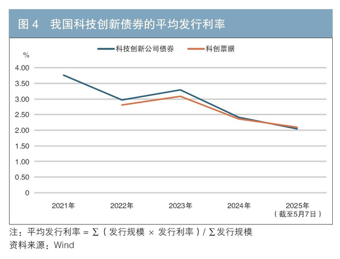 四是近年来发行利率有所下降。2024年,随着基准利率下行,科技创新公司债券和科创票据的平均发行利率分别下行至2.41%和2.36%;2025年初至5月7日,科技创新公司债券和科创票据的平均发行利率进一步分别下行至2.04%和2.09%(见图4)。