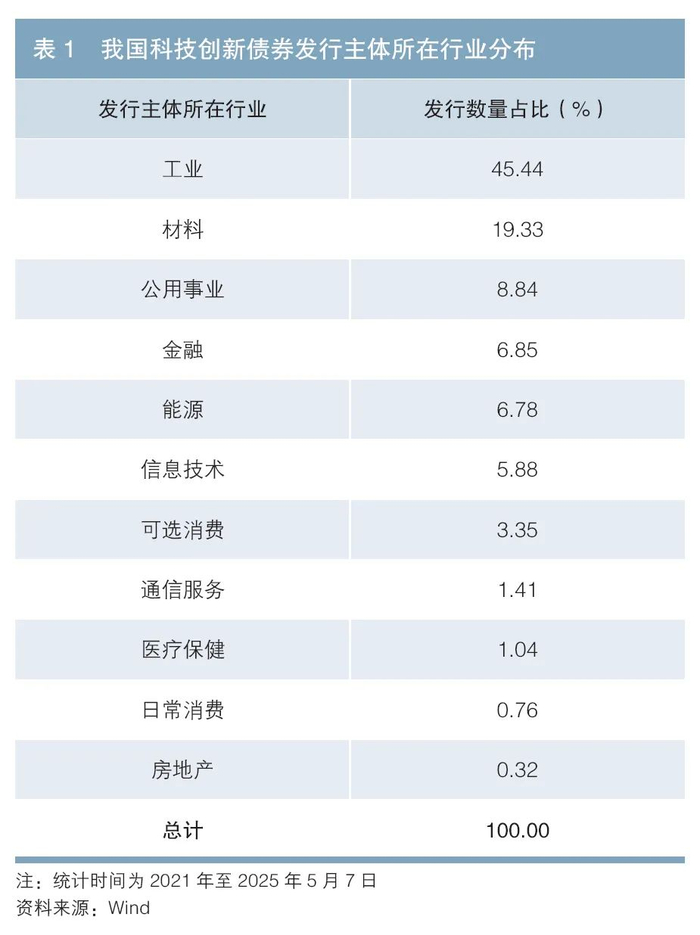 二是我国科技创新债券发行主体以国有企业和传统行业为主。从发债主体性质来看,截至2025年5月7日,我国共有614家企业发行了科技创新债券,以累计发行只数计算,国有企业占比达到85.03%。其中,2022年、2023年和2024年的国有企业占比分别为73.76%、85.24%和86.73%(见图2),呈逐年攀升态势。从发债主体所在行业分布来看,以传统行业为主。截至2025年5月7日,以累计发行只数计算,前五大发行行业依次为工业(45.44%)、材料(19.33%)、公用事业(8.84%)、金融(6.85%)和能源(6.78%),信息技术等硬科技行业占比有待进一步提升(见表1)。