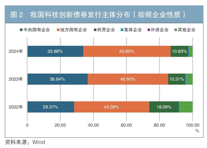 从发行主体性质来看,国有企业在科技创新债券发行中占据主导地位。近年来,随着投资机构风险偏好趋同,非国有企业获得的债券融资支持相对有限。尽管非国有企业可能在科技创新领域展现出更强的能动性,但受限于股权结构复杂、股东支持力度不足、所处行业发展前景存在不确定性或企业规模较小等因素,难以获得债券投资机构青睐,融资渠道更多依赖于传统的银行贷款及股权融资。