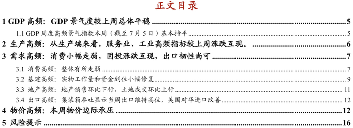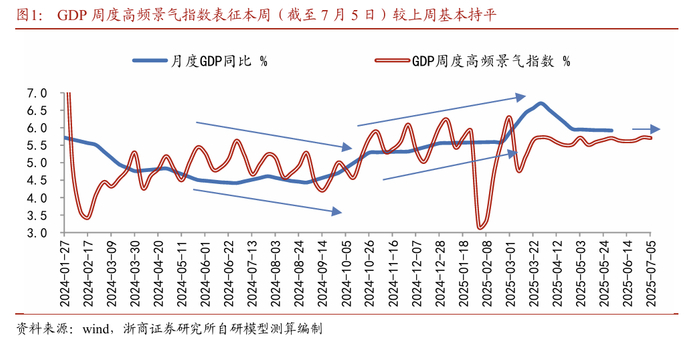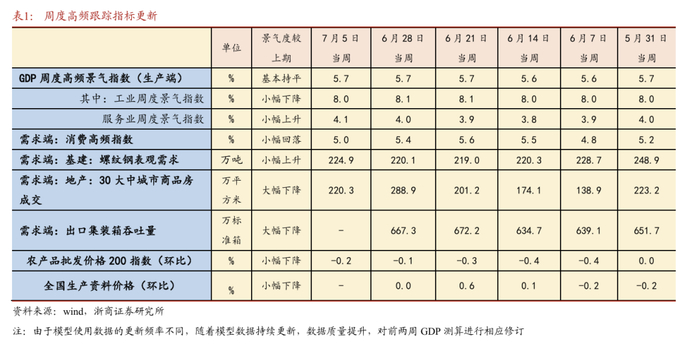 GDP周度高频景气指数本周(截至7月5日)为5.7%,较上周修订值5.7%基本持平,或表征经济增长景气相对平稳。