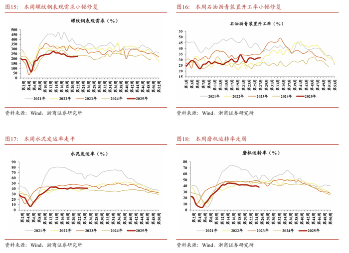 从我们选取的高频指标上来看,从生产端来看,服务业、工业高频指标较上周涨跌互现。其中服务业方面,本周11城地铁客运量较上周小幅回落,高于前两年同期;金融市场成交金额较上周有所回落,但仍高于去年同期;商品房成交面积有所回落。