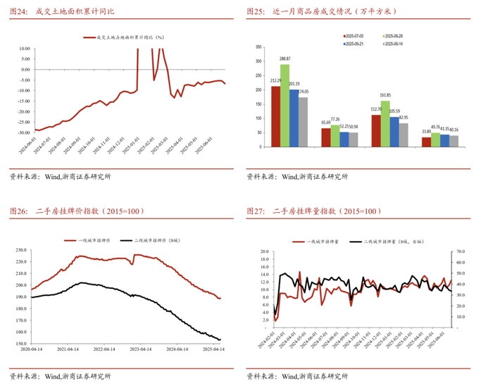 3)土地市场本周环比上行。截至6月29日,当周100城土地成交1765万平方米,较上周增加483万平方米,成交总金额增加210亿元至765亿元。2025年土地成交面积累计同比增速-6.69%,较上周-5.33%边际放缓。