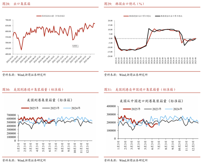 美国到港集装箱方面,截至6月26日当周,美国总进口集装箱到港57.1万标准箱,环比上行1.4%,美国包含自中国进口商品的集装箱到港18.1万标准箱,环比下行1.7%。中国对美出口离港后主要有海运(美东航线26-48天,美西航线14-20天)、清关(2-5天)、交货(1-7天)三个步骤,美国实际到港集装箱量表现延迟于中国出口数据。