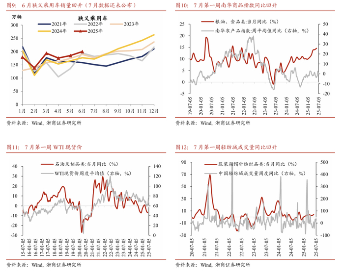 根据社零高频指数,预计7月第一周社零同比增速为5%。我们构建的消费高频指数显示,多项消费相关指标有所回落:轻纺城成交量数据显示,7月第一周轻纺城成交量同比+5.6%(前值+23.5%);南华农产品指数显示,7月第一周南华农产品指数同比+0.1%(前值+1.8%);从地铁客运量的数据来看,7月第一周12个主要城市地铁客运量回落,同比+2.5%(前值+3.9%);WTI现货价数据显示,7月第一周均价为66.3美元/桶(前值65.7美元/桶);商品房销售面积数据显示,7月第一周30大中城市商品房成交面积同比-12.1%(前值-16.3%)。