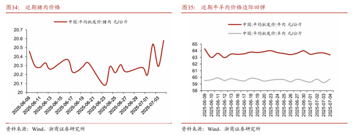 第一,猪牛羊肉价格略有波动,鸡蛋价格止跌回升。2025年第26周(2025年6月23日至6月29日)猪肉批发市场周均价每公斤20.12元,环比下跌0.1%;牛肉批发市场周均价每公斤63.49元,环比基本持平;羊肉批发市场周均价每公斤59.73元,环比上涨0.1%;白条鸡批发市场周均价每公斤17.02元,环比上涨0.1%。鸡蛋批发市场周均价每公斤7.21元,环比上涨0.6%。