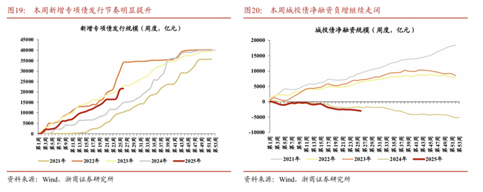 7月初建筑业周度高频数据:实物工作量和资金面继续小幅修复。实物工作量方面,本周螺纹钢表观需求、石油沥青装置开工率和水泥发运率均有小幅修复。资金面上,本周工地综合资金到位率约为58.94%,弱于去年同期的61.08%,其中房建项目资金到位率继续修复,达到51.50%。新增专项债方面,截至本周全国地方政府新增专项债发行累计21635亿元,占今年政府工作报告设定目标的49%,近期发行节奏明显提升。城投债净融资方面,截止本周全国各地城投债净融资累计-3002亿元,负增幅度较去年继续走阔。