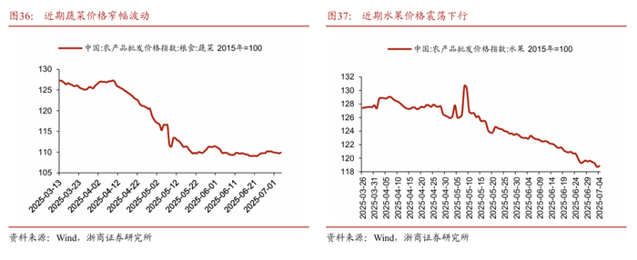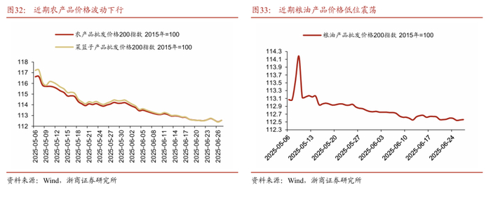 综合分析,本周物价表现总体承压,消费品价格高频数据涨跌互现,但工业品价格走平。据农业农村部监测和我们测算,截至7月5日当周,“农产品批发价格200指数”环比上周下降0.16%,全国农产品批发市场猪肉平均价格环比上周上涨0.75%,重点监测的28种蔬菜平均价格环比上周下降0.5%,重点监测的6种水果平均价格环比上周下降0.81%。另一方面,上周(2025年6月23日至29日)全国食用农产品市场价格比前一周环比上涨0.2%,生产资料市场价格较上周大致持平。我们总体来分析,2025年第26周(2025年6月23日至6月29日)的必选品价格在结构上呈现如下三方面的特征。