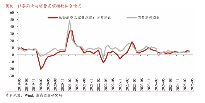 为了更好地预判社零走势与感受消费真实温度,我们可以通过找寻社零分项中占比较高项目日度或周度的高频数据,对月频的社零指标进行拟合,进而可以大致推测社零当月情况。在第一篇经济周周看报告中,我们搭建了消费高频指数,具体方法是在社零高频指标中,选取了拟合度较高的乘用车、WTI原油现货价、30大中城市商品房成交面积与地铁客运量作为自变量,先将其做标准化处理,然后通过多元回归拟合出各个高频指标对应的权重并加总得出当月的社零预测值。我们发现拟合指标与社零走势具有较高的同步性,拟合程度也比较好,可以作为社零预判的前瞻指标。